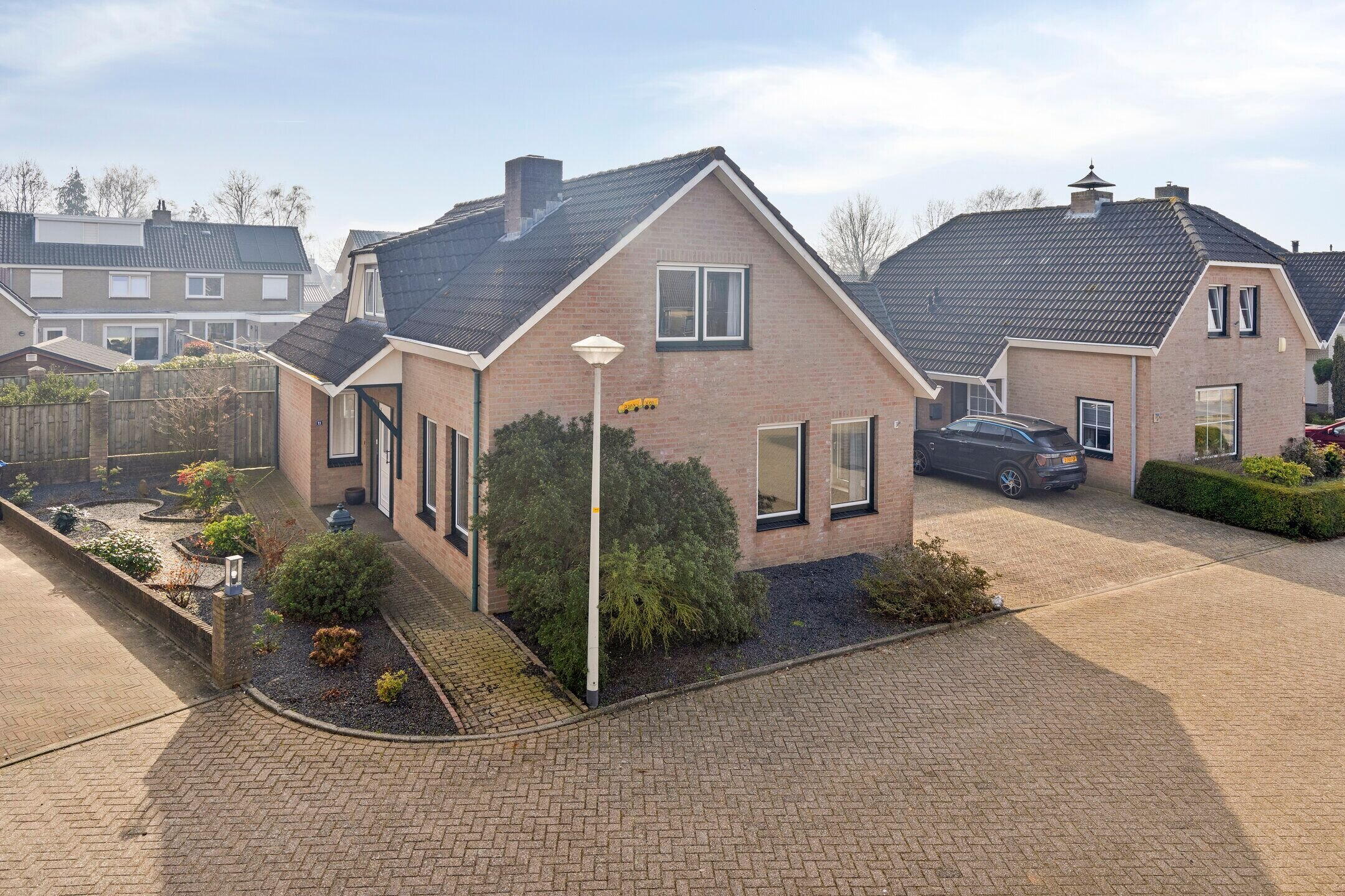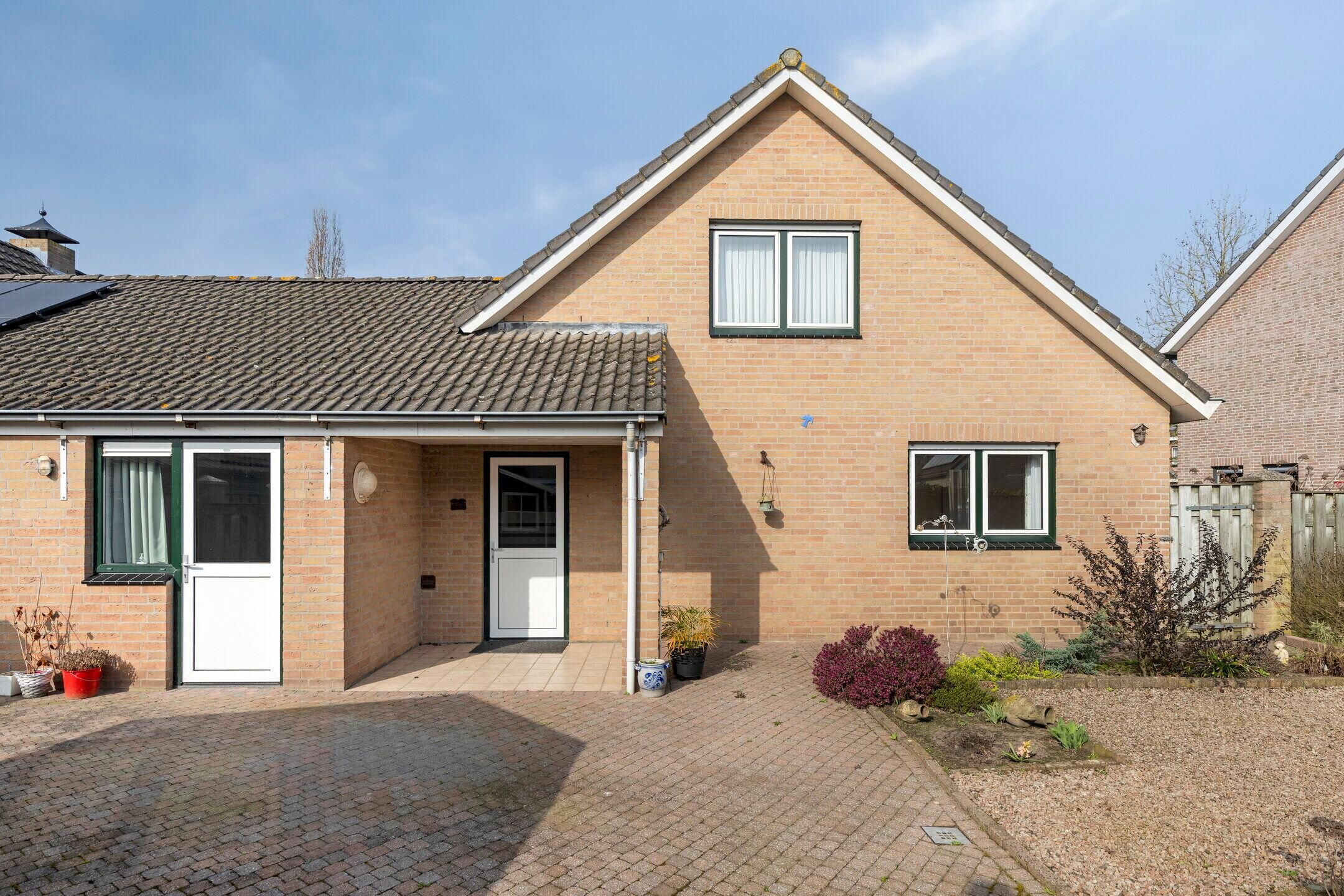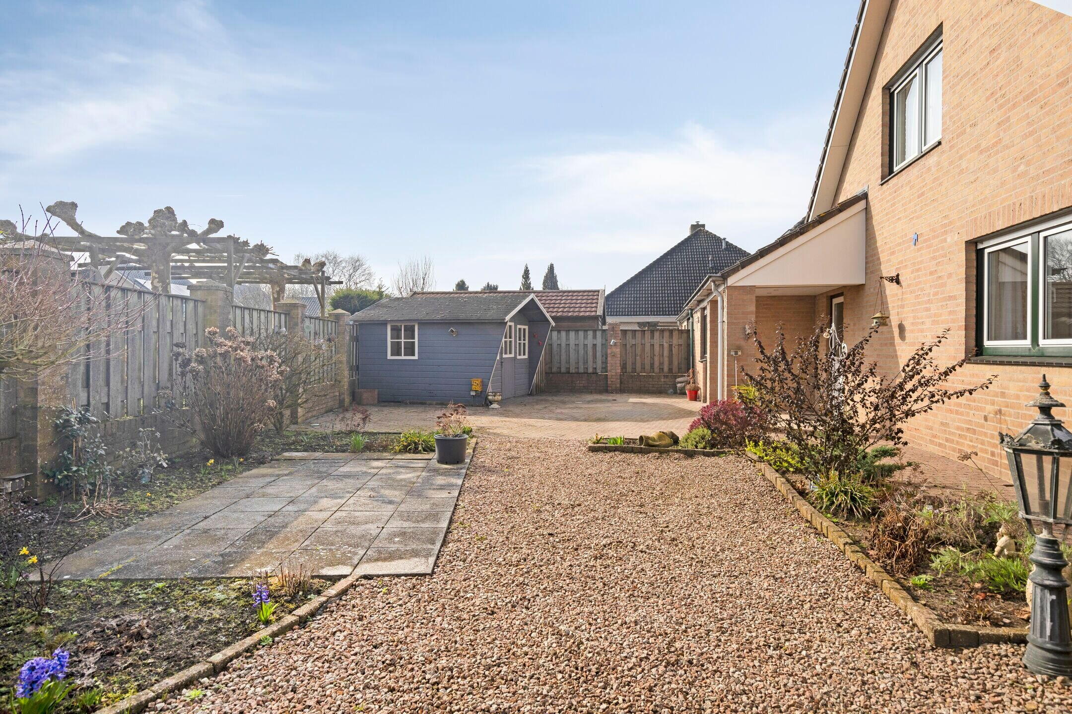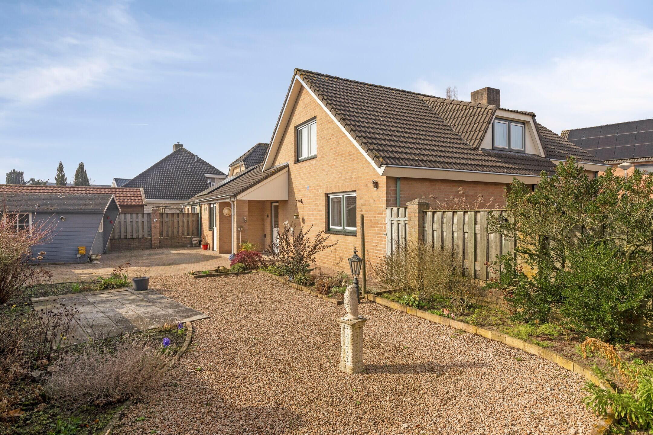 De voor- en zijtuin zijn netjes aangelegd met een klinkerpad, grind en diverse beplanting. Aan de rechterzijde ligt een geklinkerde oprit die naar de garage leidt.