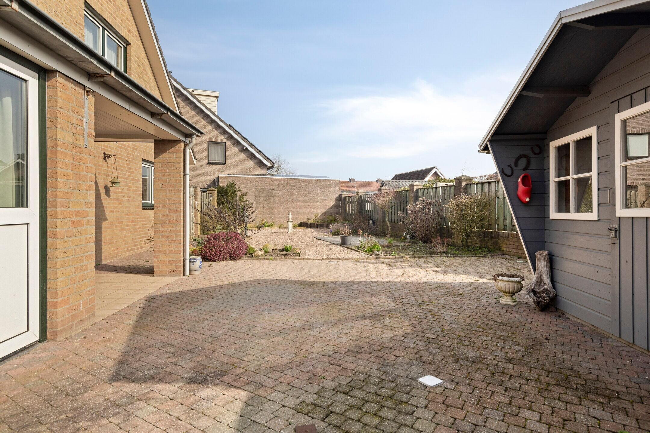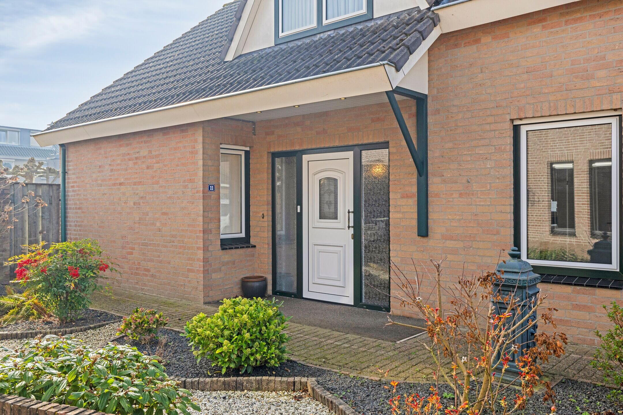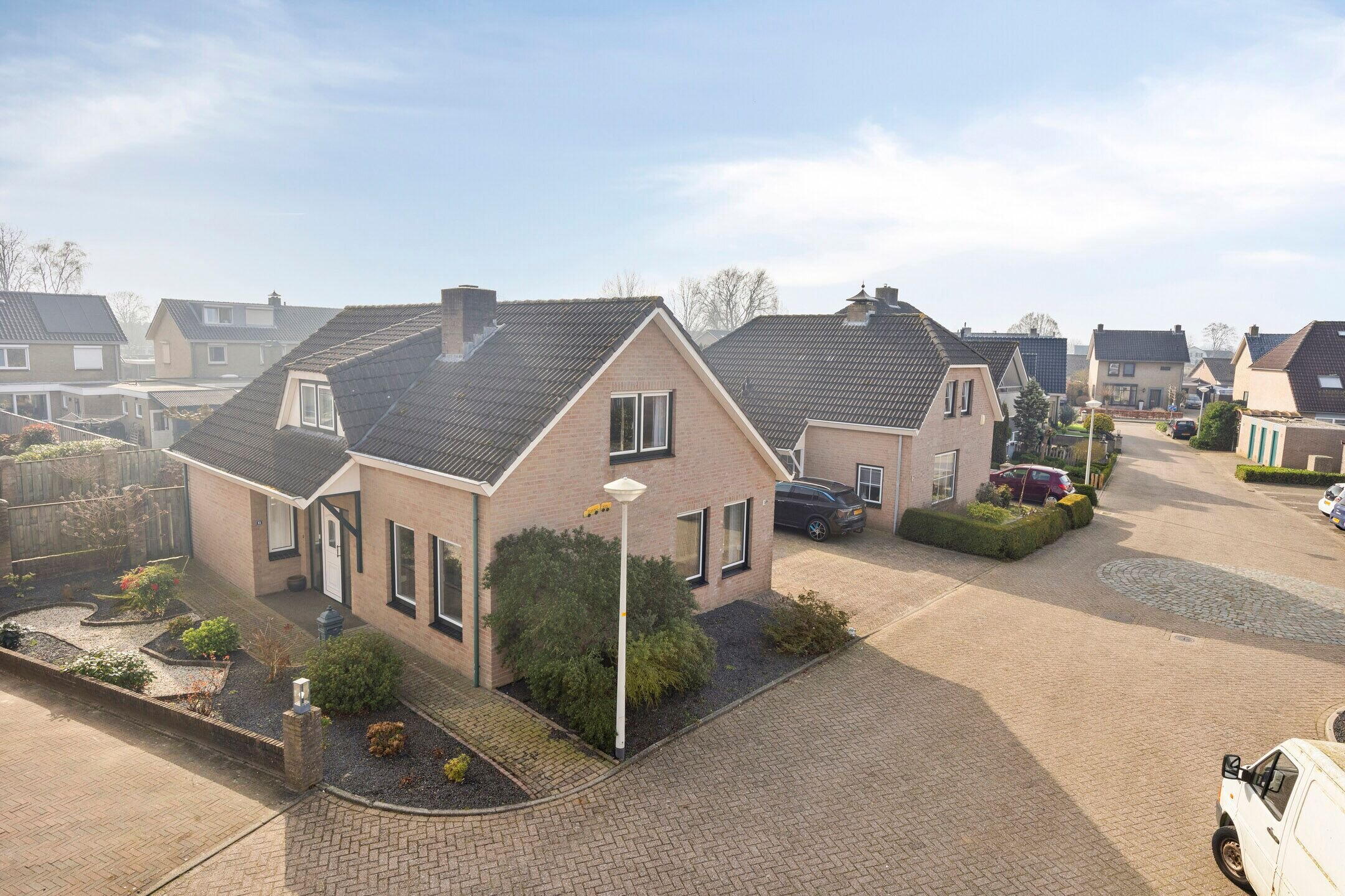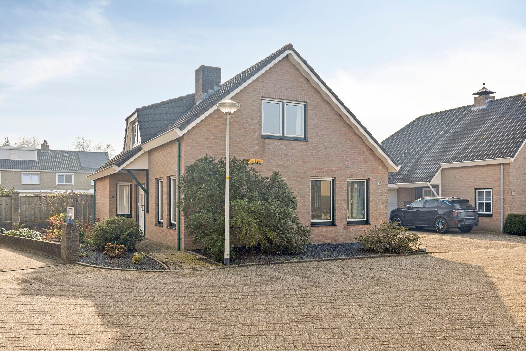 De voor- en zijtuin zijn netjes aangelegd met een klinkerpad, grind en diverse beplanting. Aan de rechterzijde ligt een geklinkerde oprit die naar de garage leidt.